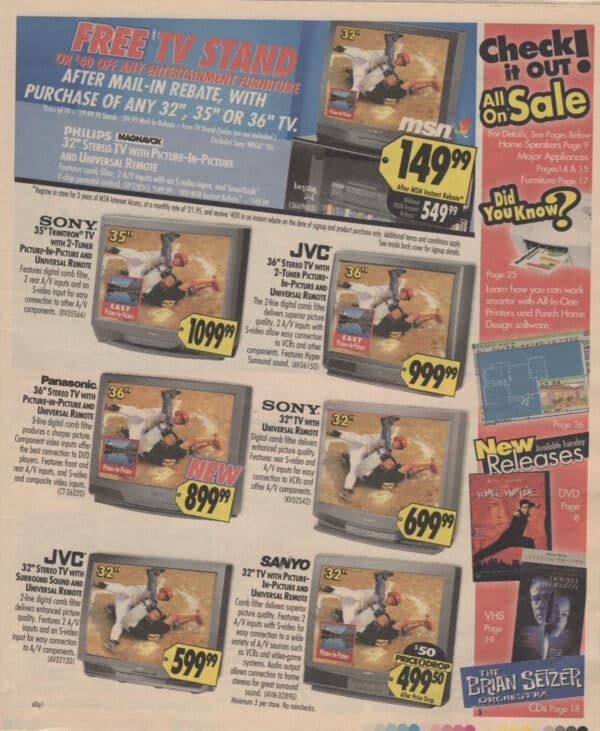 In 2000, you could buy a 36″ TV for $1,000 ($1,880 in today’s money) and today, if you even find anything that small, it’ll be less than a tenth of that price.