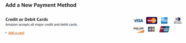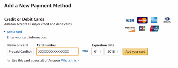 Add a new card - Enter your card information. Make sure to uncheck “Use this card across all of Amazon”. Then click “Add your card”.