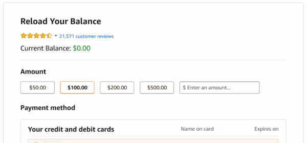 Use this address - Now that your card is added, you can use it to top up your gift card balance. Click the “Gift Cards” link at the top. On the gift cards page, click “Reload Your Balance”.