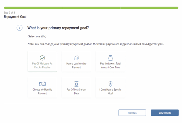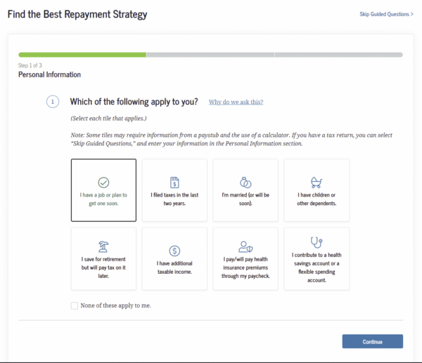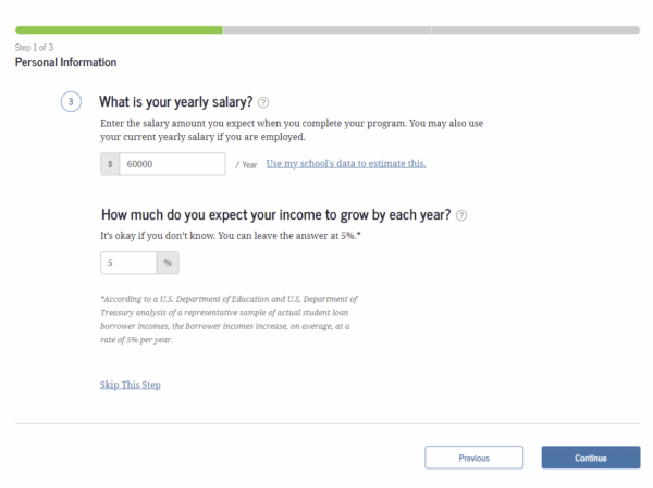 This first step asks you demographic information about your job and marriage situation. This is because it helps to estimate your Adjusted Gross Income (AGI), which is relevant when calculating income-based repayment options.