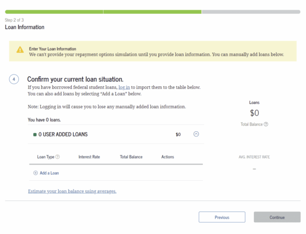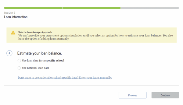 You have a few options here for entering your loan information. There’s a big song and dance about entering the name of the place where you got your degree, and what your degree is, and it will look up average student loans for that situation.