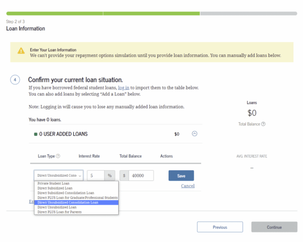 For this exercise, I’m adding a single $40,000 Direct Unsubsidized Consolidation Loan at 5%. Click Add a Loan to add your own details and then click Save and Continue.