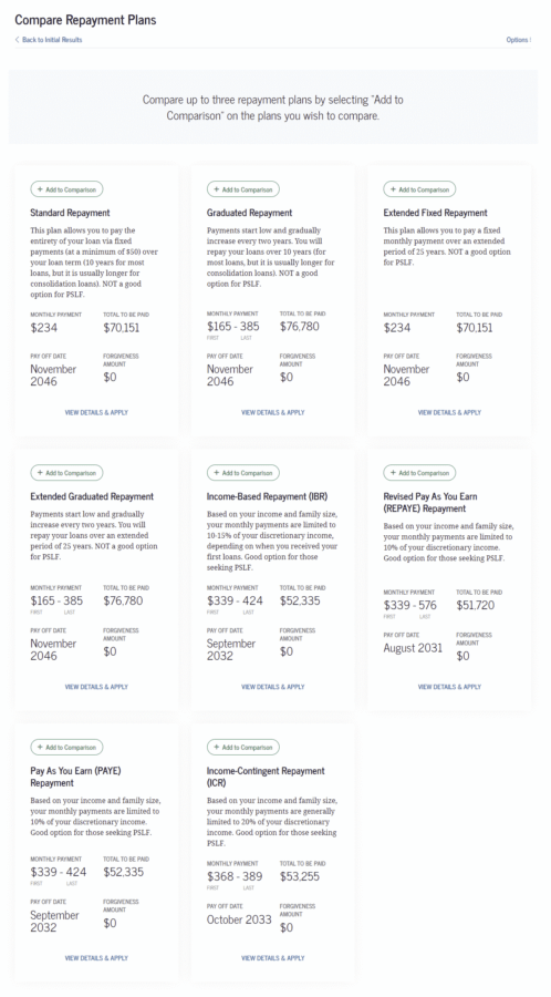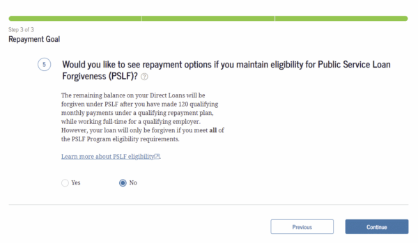 Next, it will ask if you are looking to attain Public Service Loan Forgiveness, the program that allows for student loan forgiveness if you work in certain types of jobs.