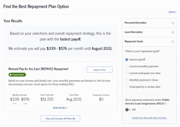 In my example, the result that is given is the Revised Pay As You Earn (REPAYE) Repayment. This is because I chose the “fastest payoff” option.