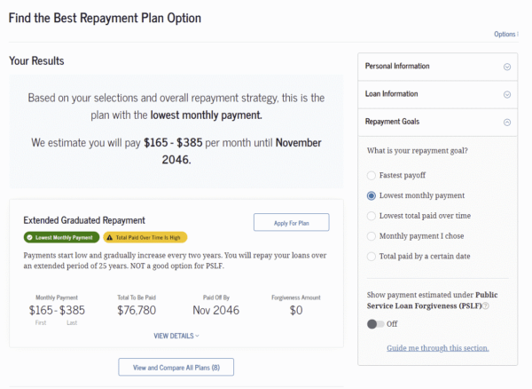 If I were to switch the radio buttons on the right to, say, lowest monthly payment, the answer changes to “Extended Graduated Repayment“. (Note that this adds $25,000 and 15 years to the life of the loan. That’s the price you pay to lower your payments.)